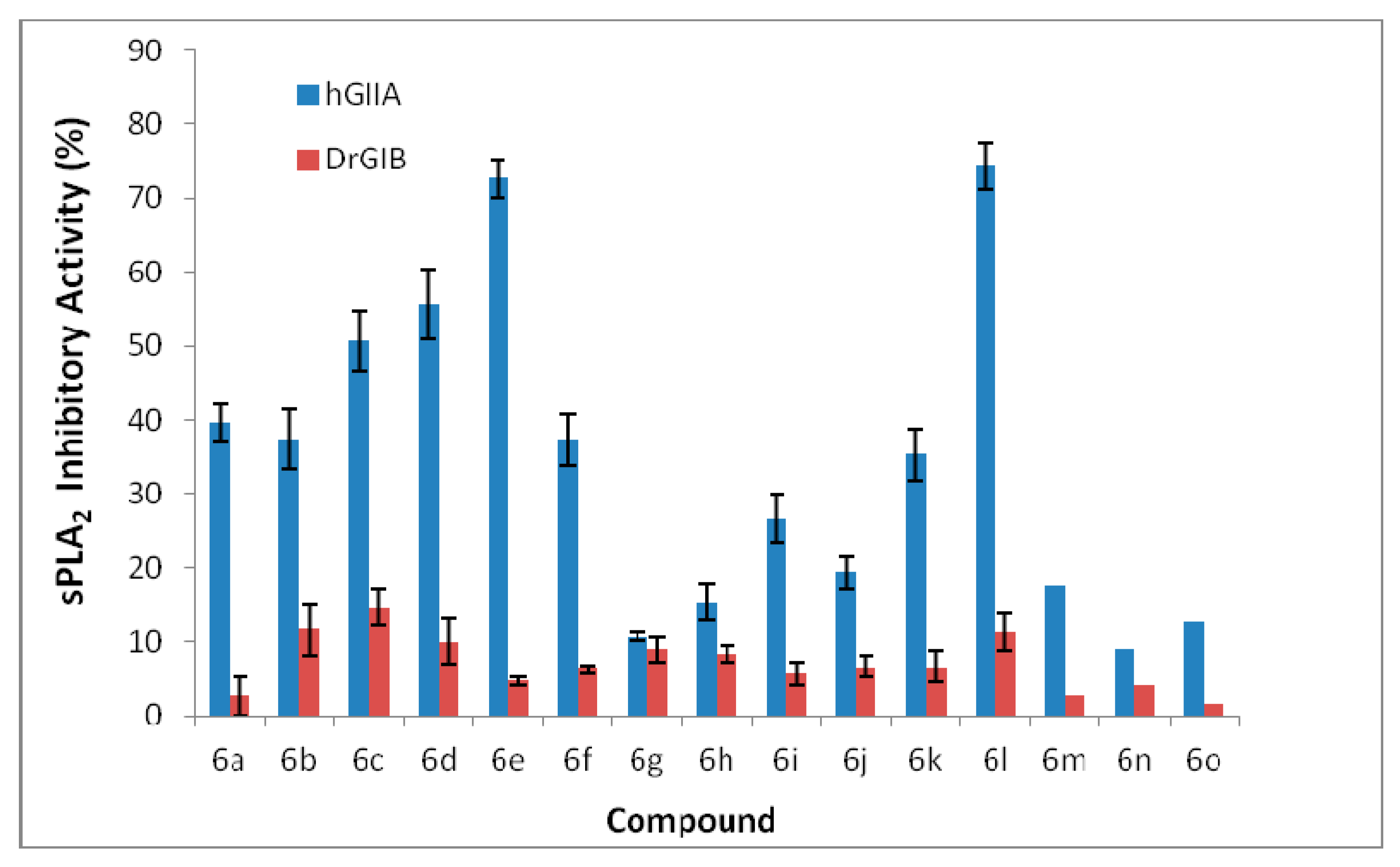 Inhibitory activity (%) of compounds 6a–o against sPLA2 (hG-IIA and DrG-IB).