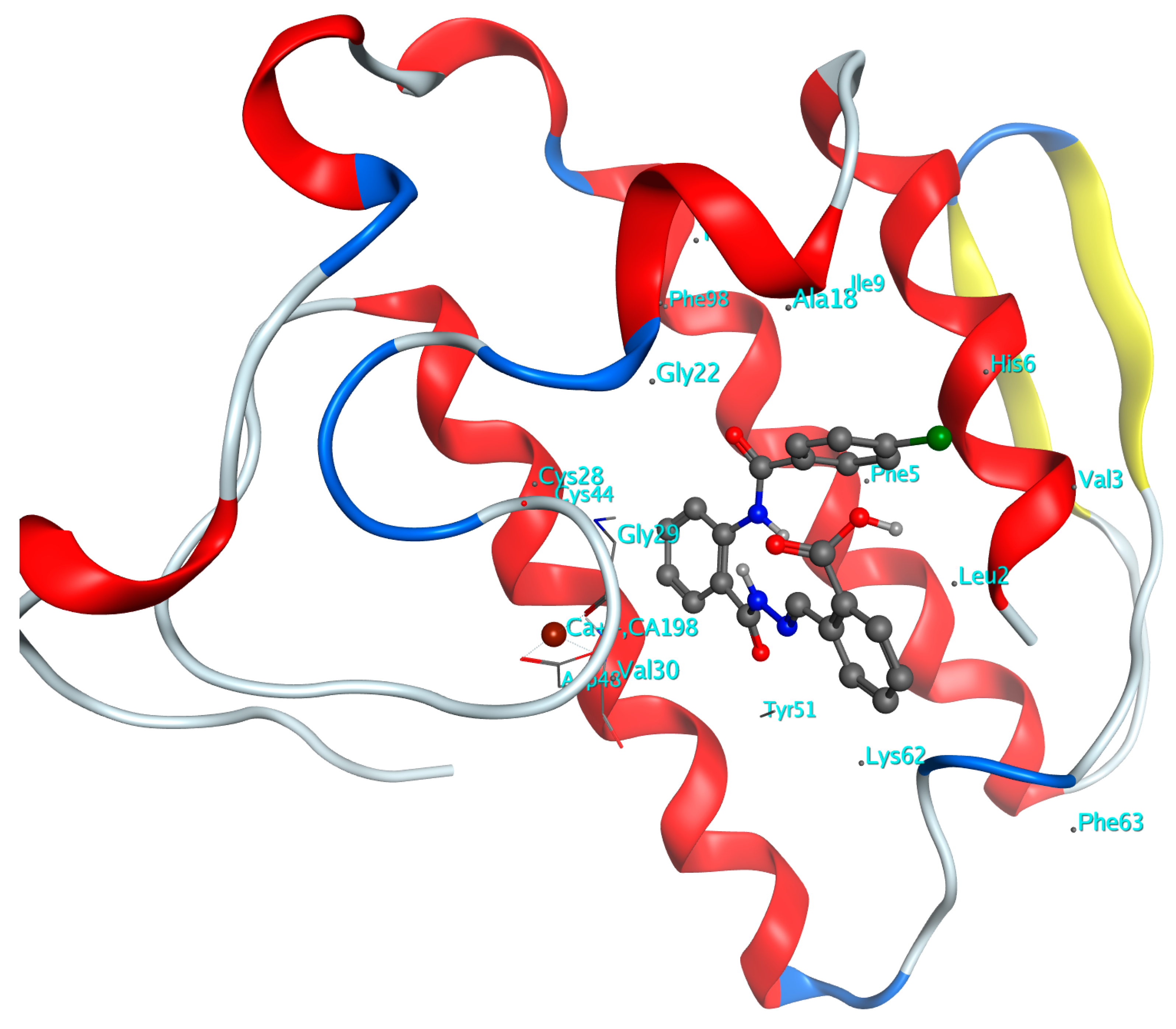 The docking simulations for 6a–o in active site of GIIAsPLA2 are presented in Supplementary Materials, Figure S1. Results of docking simulations for compound 6l, the most active anti-GIIAsPLA2 enzyme, depicted here as a representative in Figure 3, revealed that it interacts with hydrophobic and polar residues of active site of GIIAsPLA2. Compound 6l has adopted “U” shape with its central benzene ring oriented towards the polar residues viz. His6, Gly22, Asp48, and Val30. The –CONH–N– moiety is responsible for interactions with Phe5 and His47. The –CO–NH–N= moiety bridging the two benzene rings as a polar linker has incorporated good flexibility to the ligand, hence such a flexible moiety is beneficial for further amendments. The –Cl and –COOH groups are oriented toward Leu2 and Val3 due to polar interactions. The –CO– group of –CONH– group is close to Gly22. Hence, –CONH– group is important group for retention in future optimizations.