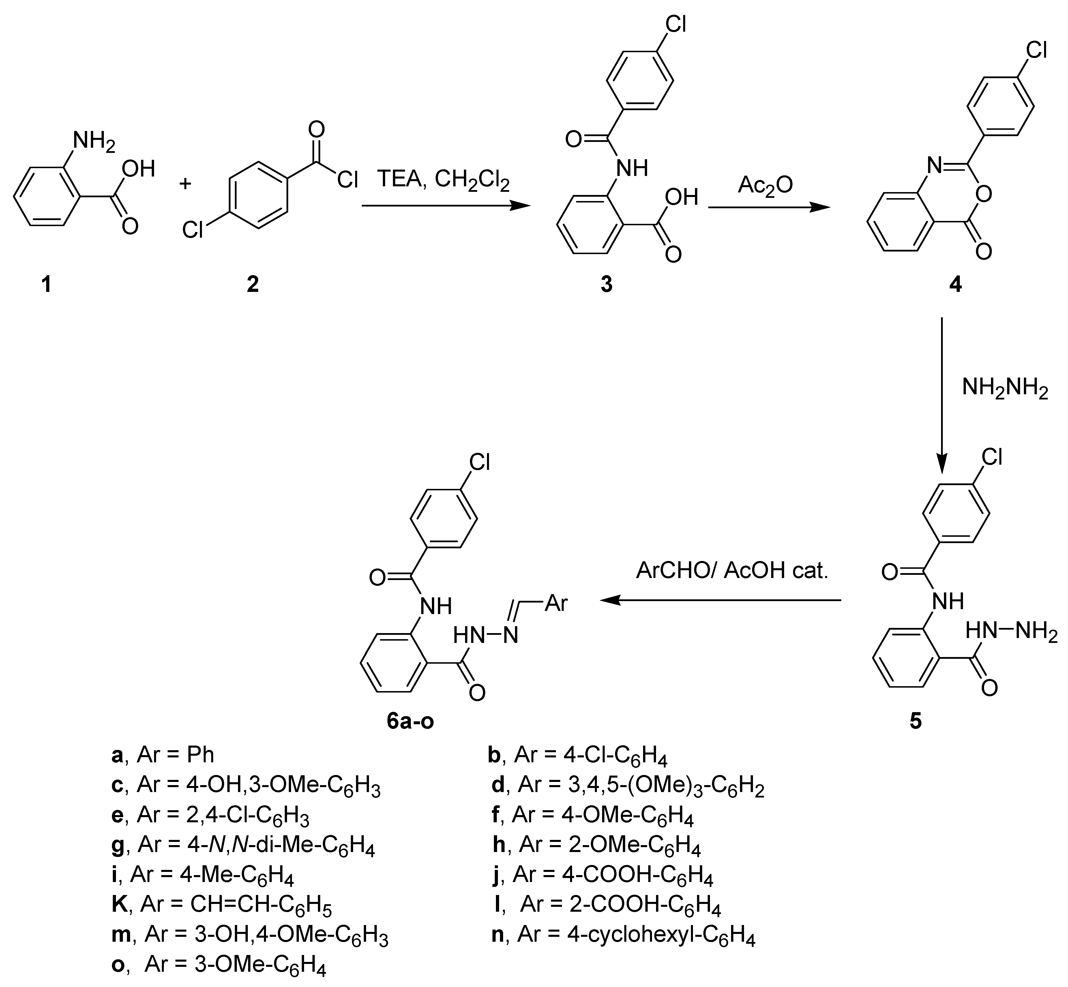 Benzoylation of anthranillic acid 1 with 4-chlorobenzoyl chloride 2 in methylene chloride in the presence of triethylamine afforded the corresponding amido acid 3 which upon boiling with excess of acetic anhydride underwent intramolecular cyclization and afforded benzo[d][1,3]oxazin-4-one derivative 4. Nucleophilic attack by the amino group of hydrazine hydrate on the carbonyl group of the latter benzoxazinone, and subsequent ring opening gives the key intermediate 4-Chloro-N-(2-hydrazinocarbonyl-phenyl)-benzamide 5. Condensation of hydrazino derivative 5 with a variety of aromatic aldehydes yielded the desired hydrazones 6a–o (Scheme 1). The structures of these products were confirmed based on their spectral data and elemental analyses. In general, the IR spectra of compounds 6a–o displayed two absorption bands at νmax 3421–3292 cm−1, which are attributed to the two (NH) groups, and two absorption bands at νmax 1684–1657 cm−1 due to the two carbonyl groups. In addition, the (C=N) groups appeared around 1598–1579 cm−1. Moreover, the 1H-NMR spectra of these compounds indicated the disappearance of the spectral line due to NH2 group of the starting hydrazide 5 and appearance of two broad singlet signals at δ 12.37–11.08 ppm corresponding to 2NH groups, singlet signals at δ 8.84–8.30 ppm due to the characteristic azomethines’ protons (N=CH) in addition to signals attributed to the aliphatic and aromatic protons at the expected chemical shift values. Analogously, the 13C-NMR spectra proved the presence the two C=O groups at δC 165.61–163.86 ppm, azomethine carbons’ at 151.46–145.10 ppm and the aliphatic and aromatic carbons at the expected chemical shift values. The mass spectra of all of the synthesized compounds revealed the existence of the parent ion peaks. Finally, the C, H, N elemental analyses of all of the synthesized compounds were in agreement with the proposed structures.