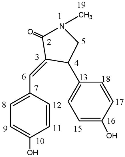 (Z)-3-(4-Hydroxybenzylidene)-4-(4-hydroxyphenyl)-1-methylpyrrolidin-2-one was obtained as white crystal, and displayed a molecular formula of C18H17NO3 ([M − H]−, calcd., m/z 294.1130; found, m/z 294.1135) as determined by high-resolution electrospray ionization mass spectrometry (HRESIMS). The 1H- and 13C-NMR spectra showed 15 proton and 14 carbon signals (Table 1). According to the HSQC spectrum and a previous report, proton signals at δH 6.66 (2H, d, J = 8.1 Hz), 7.23 (2H, d, J = 8.2 Hz), together with their corresponding carbon signals at δC 114.9 and 131.8, respectively, as well as signals at δH 6.72 (2H, d, J = 8.0 Hz) and 7.05 (2H, d, J = 8.0 Hz) with their corresponding carbon signals at δC 115.3 and 127.7, respectively, suggested the presence of two symmetrical para-substituted aromatic protons []. Besides, signals at δH 4.48 (1H, d, J = 7.8 Hz), 3.27 (1H, d, J = 9.9 Hz), and 3.98 (1H, d, J = 9.3 Hz), together with their corresponding carbon signals at δC 40.33 and 57.0, respectively, and a carbonyl carbon signal at δC 170.8 revealed a pyrrolidine-2-one ring []. Furthermore, the existence of a methyl group at δH 2.98 (3H, s) was noticeable in the 1H-NMR spectrum.