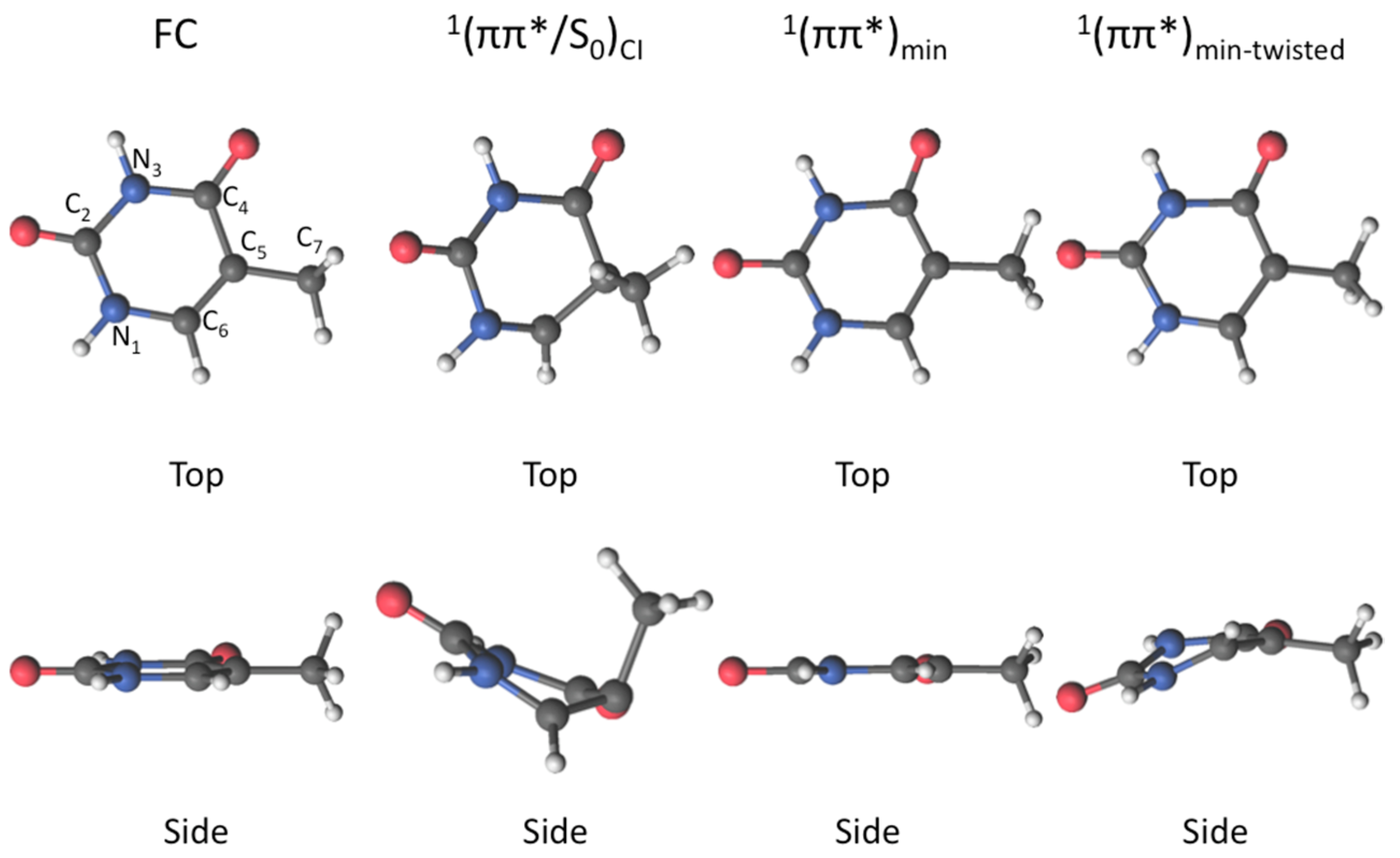 Several components in different time ranges have been detected over the years in time resolved experiments on DNA nucleobases: in the sub-ps regime, a bi-exponential decay was characterized for nucleobases, nucleosides or nucleotides [3,24,60,62], being mainly ascribed to ultrafast reactions along the initially accessed 1(ππ*) PEH, whereas a single component has also been observed in the few-ps timescale and being ascribed to dark nπ* states [55], and a longer component closer to the ns regime has been attributed to the eventual involvement of triplet states [55,56]. Theoretically, most studies agree in the initial involvement of the 1(ππ*) state for the sub-ps channels, having characterized a series of key structures in its PEH that rationalize its concrete role. Figure 1 displays these structures for thymine, the system under study in the present work. They correspond to two different excited state minima, one planar [11] and one partially twisted or “boat-like” found in more correlated computations or solvated environments [24,34,63,64], and an “ethene-like” CI [65,66] connecting the 1(ππ*) and ground states. The CI is usually employed to rationalize the ultrafast decay of thymine [8] and the extremely low fluorescence quantum yields recorded experimentally [62], and was initially reported in the pioneering study of Perun et al.[22]. The involvement of either dark nπ* or triplet states are usually ascribed to non-adiabatic interactions along the deactivation routes in these systems, which populate nπ* states that can in turn funnel the population towards the triplet manifold via intersystem crossing [67] given the large spin-orbit couplings featured [30,68,69], in agreement with El-Sayed rules [70].