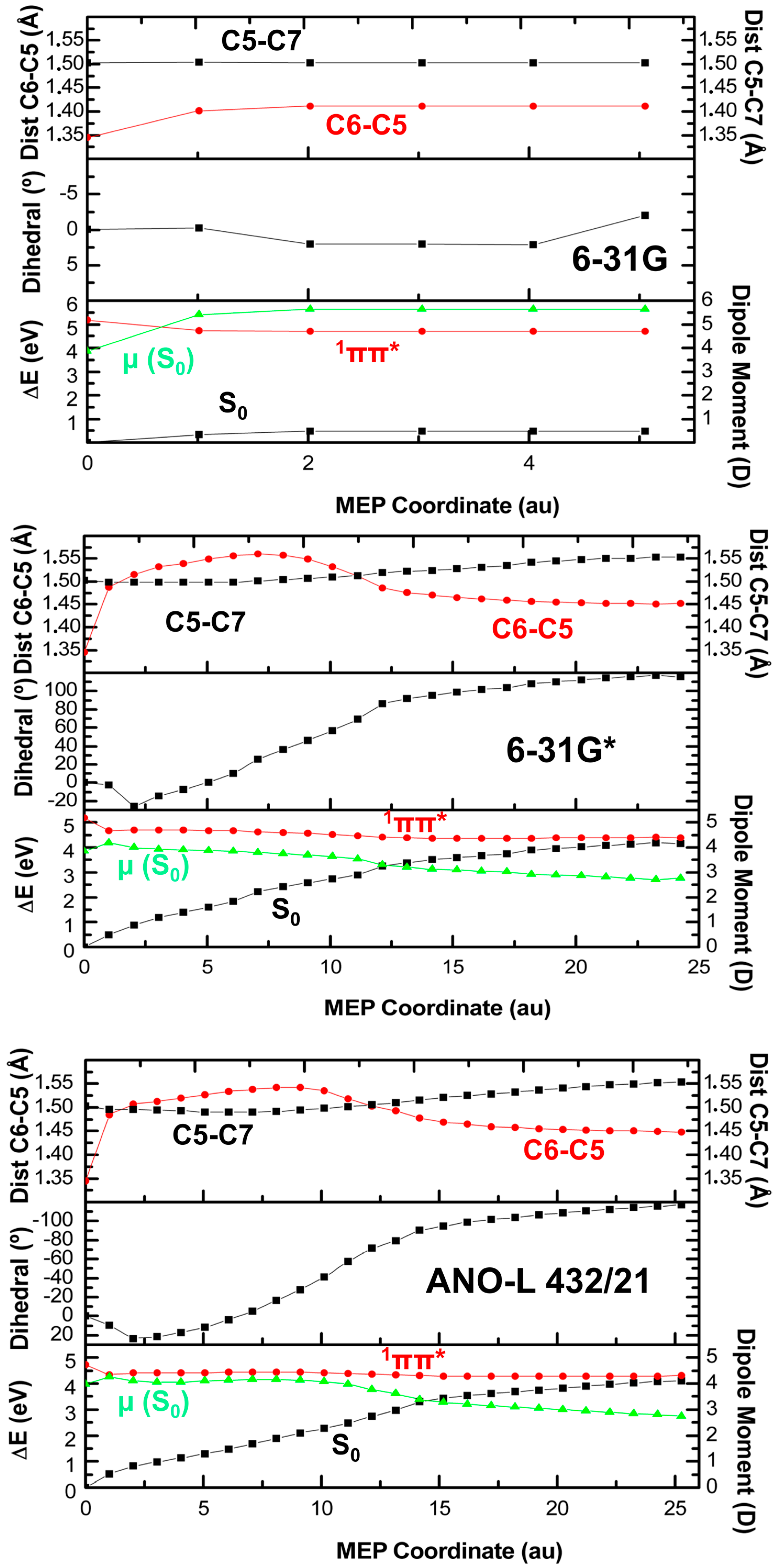 Figure 2 shows the computed MEPs by using different basis sets, increasing the amount of electron correlation considered. As can be seen, the MEP computed with the 6-31G basis set leads to the planar minimum 1(ππ*)min in the 1(ππ*) hypersurface (see Figure 1), as previously reported by Perun et al. [22]. Using the same active space but increasing the flexibility of the one-electron basis set employed yields a very different result though (cf. Figure 2). In this case, the system decays in a barrierless manner towards the ring-puckering ethene-like crossing 1(ππ*/S0)CI. The same result holds true after adding extra correlating orbitals to the active space [CASSCF(10,11)] (see Figure S1), thus validating the previous result obtained with the 6-31G* basis set and the CASSCF(10,8) methodology. Active space selection and validation becomes essential as the size of the system under study increases and computations become impractical [64], and has also been documented to affect the outcome in photoinduced dynamics [71]. This illustrates the importance of the electronic correlation in order to give a proper description of the photochemical pathways actually accessible in a given molecular system [72]. Moreover, the technique employed to optimize the excited state seems to also play a role [8]. Geometry optimization of the 1(ππ*) state with the 6-31G* basis set yields the planar minimum 1(ππ*)min (cf. Table 1), identical to the one found with the CASSCF/6-31G MEP, while the MEP at the CASSCF/6-31G* decays to 1(ππ*/S0)CI as shown in Figure 2. In other words, for thymine, determination of the different stationary points independently (geometry optimization for the ground state and the excited state using standard convergence thresholds, and CI search) at the CASSCF/6-31G* level, and connecting those regions of the hypersurface subsequently by linear interpolation of internal coordinates (LIIC), offers a view of the photochemistry through a well-defined minimum on the excited state hypersurface. A similar behavior is observed when the geometry optimizations are carried out at the CASPT2 level, with the sole difference that the minimum found along the hypersurface can be slightly twisted or “boat-like” 1(ππ*)min-twisted (cf. Figure 1) [17,34,63]. The conclusions derived from those studies seem to be dependent on the strategy used, highlighting the additional insights provided by more sophisticated MEP techniques to map PEHs, while stressing the need for computing experimental observables derived from accurate PEHs to be able to unambiguously compare face-to-face with the experiment [17,73].