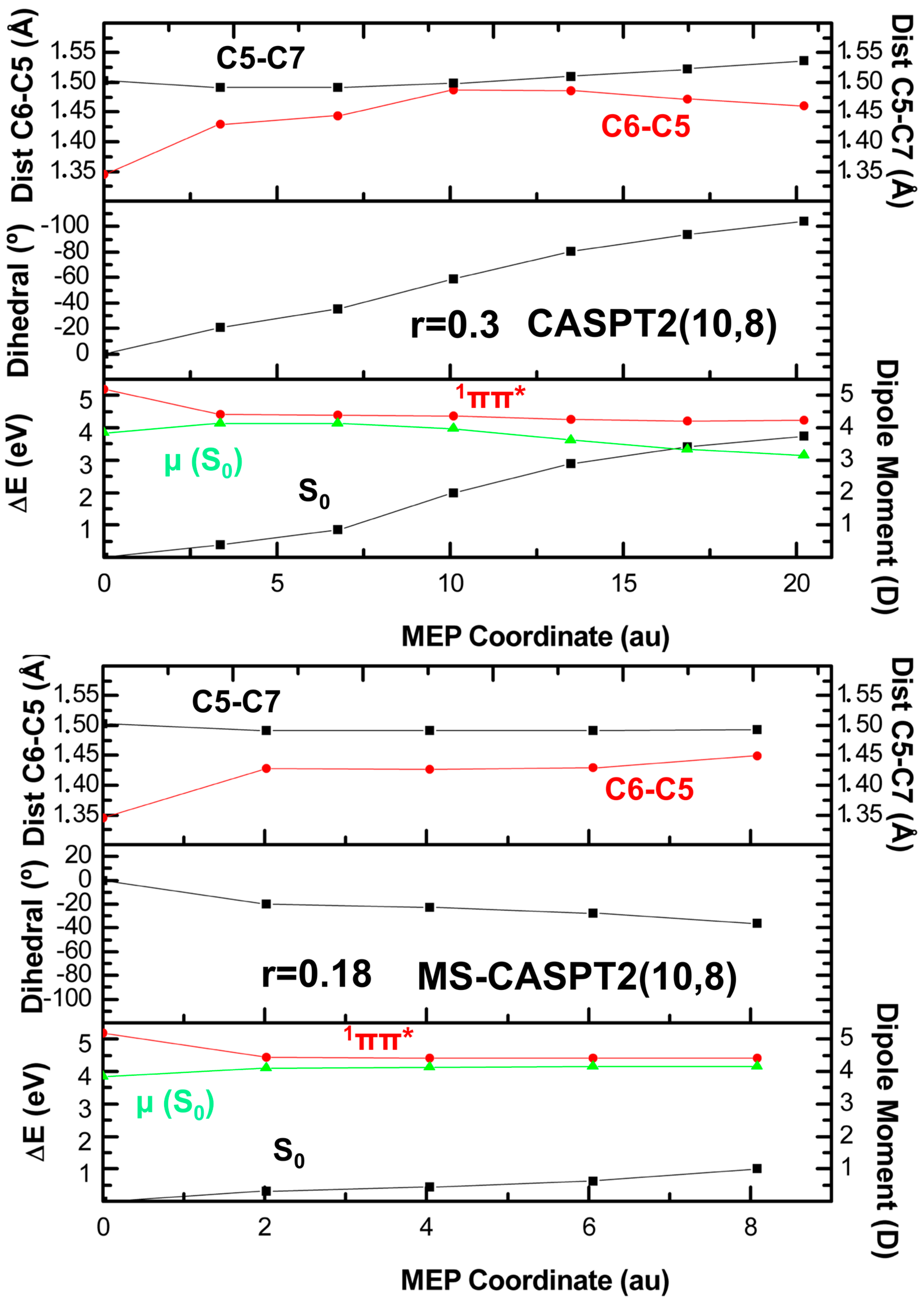 Representative MEPs yielding the different key structures on the 1(ππ*) state hypersurface are depicted in Figure 3. No planar structure is obtained by employing the MEP strategy at the CASPT2 level. Instead, the presence of a twisted minimum along the decay path, previously reported in the literature [34,63], appears to be the main structure hampering the barrierless route towards the 1(ππ*/S0)CI. This relates to what has also been found for PSB-3, where the dynamically correlated CASPT2 displays a more stable minimum under the planar minimum described by CASSCF [63]. Lower values of r favor this situation in which thymine finds itself to be stranded in a shallow minimum. Two different behaviors can be distinguished by inspection of Figure 3. In CASPT2/r = 0.09 (see Figure S3) and MS-CASPT2/r = 0.18 the MEPs lead towards a minimum, which is different from the planar minimum reported above at the CASSCF level. CASPT2/r = 0.30, on the other hand, exhibits a barrierless pathway towards the CI with the ground state. This finding is also obtained at the MS-CASPT2/r = 0.30 level with a slight difference in the dihedral angle and the C6-C5 and C5-C7 bond distances at the CI geometry.
