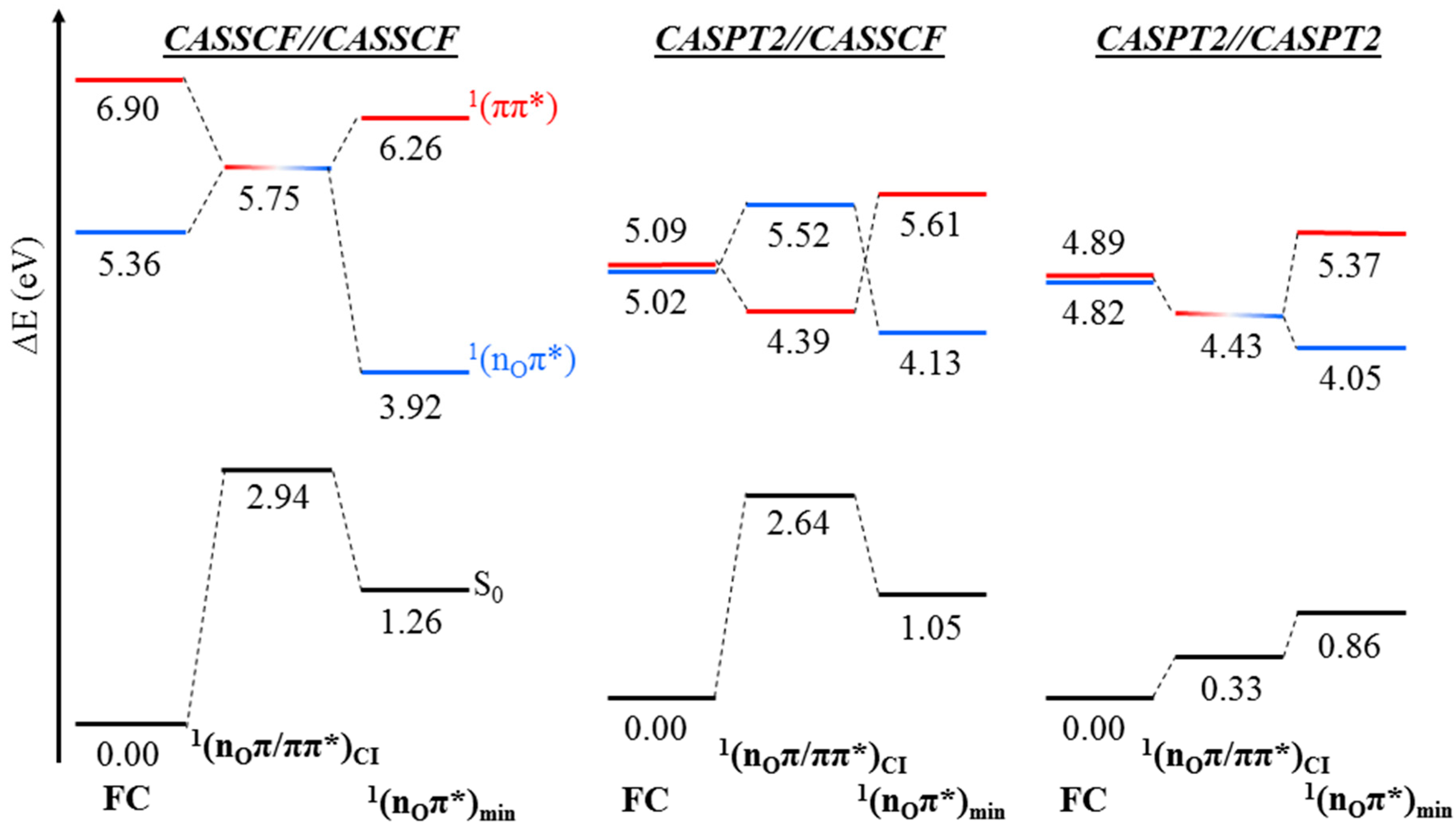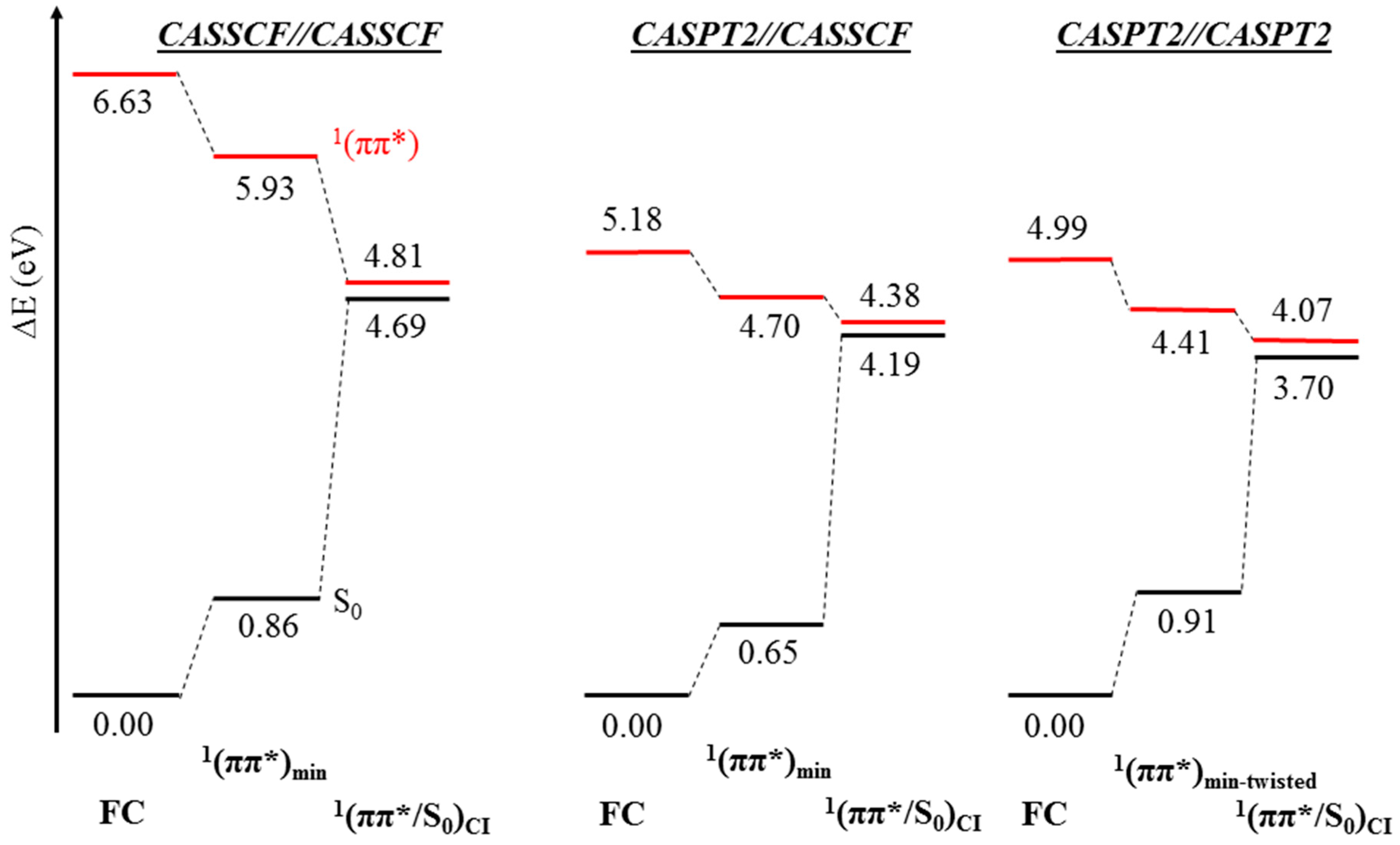 This is further assessed in Figure 5, where an energy diagram of the involvement of the 1(nOπ*) state at both CASSCF//CASSCF and CASPT2//CASPT2 levels is shown, together with the energy profile arisen from the CASPT2//CASSCF protocol. Figure 5 depicts pronounced differences. The main ones are: i) in the Franck-Condon (FC) region, a large energy gap between the bright 1(ππ*) and dark 1(nOπ*) states appears with the CASSCF//CASSCF approach, while at the CASPT2//CASPT2 level, the states appear to be near degenerate, and ii) the twisted CASSCF 1(nOπ*) minimum appears to be much lower in energy with respect to 1(nOπ*/ππ*)CI than its planar CASPT2 counterpart. This artificial stabilization is corrected at the CASPT2//CASSCF level (cf. Figure 4). The former difference (i) will have important incidences in the early time events of molecular dynamics simulations employing the CASSCF method, where kinetic energy is built along the pathway from the initially accessed 1(ππ*) state towards the 1(nOπ*/ππ*)CI that may artificially increase the population on the 1(nOπ*) state, whereas the latter discrepancy (ii) is expected to ensure the population trapping in the 1(nOπ*) state. On the other hand, at the CASPT2//CASPT2 level, both 1(ππ*) and 1(nOπ*) states are degenerate at the FC region and both 1(nOπ*/ππ*)CI and the 1(nOπ*) minimum appear within half an eV, which is expected to increase the re-crossing back to the 1(ππ*) manifold [25] and thus reduce the population ending in the 1(nOπ*) state [55].