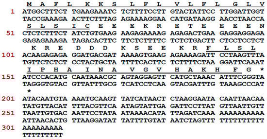 Nucleotide and translated open-reading frame amino acid sequences of cloned cDNA encoding the precursor of Phylloseptin-PT (PS-PT). The putative signal peptide is double-underlined, the mature peptide is single-underlined, and the stop codon is indicated by an asterisk.