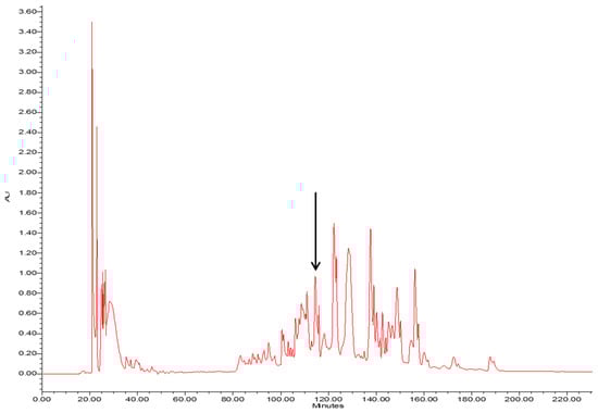 The RP-HPLC chromatogram of the skin secretion of Phyllomedusa tarsius. The components were monitored at a wavelength of 214 nm. The retention time of phylloseptin-PT is marked by an arrow.