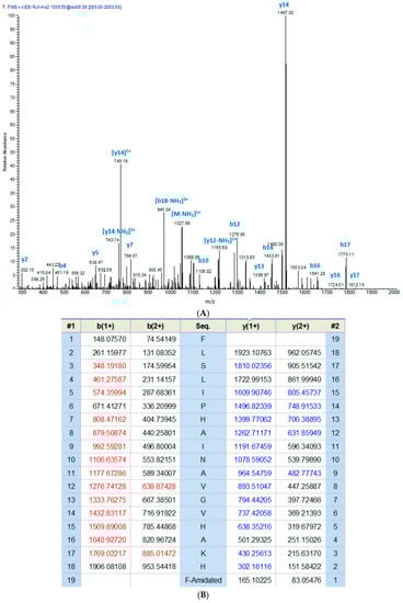 Ion spectrum of phylloseptin-PT (A) MS/MS data from collision-induced dissociation of the doubly-charged precursor ion (1036.50 m/z). (B) The calculated fragment ions from the sequence with those observed following MS/MS indicated in blue and red typefaces.