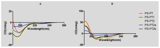 Circular dichroism (CD) spectra of PS-PT and its analogues (100 μM) (A) in 10 mM ammonium acetate water solution and (B) in 50% 2,2,2-trifluoroethanol (TFE)/10 mM ammonium acetate water solution.