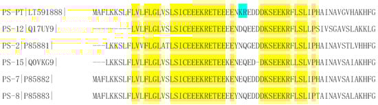 Alignment of precursors of PS-PT and other phylloseptin peptides isolated from Phyllomedusa hypochondrialis azurea. Consensus residues are highlighted in yellow and specific sign is indicated in blue.