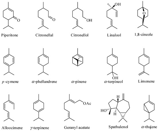 Although the EOs are found in the leaves of more than 300 species of Eucalyptus, fewer than 20 species have been commercially explored for EO production [46,49]. In terms of the chemical composition of these EOs, they are complex mixtures of substances, generally containing 20 to 80 compounds, differing in their concentrations. Terpenes and terpenoids are the major components found in EOs obtained from the leaves of Eucalyptus [38,50,51,52,53,54,55] as illustrated in Figure 1.