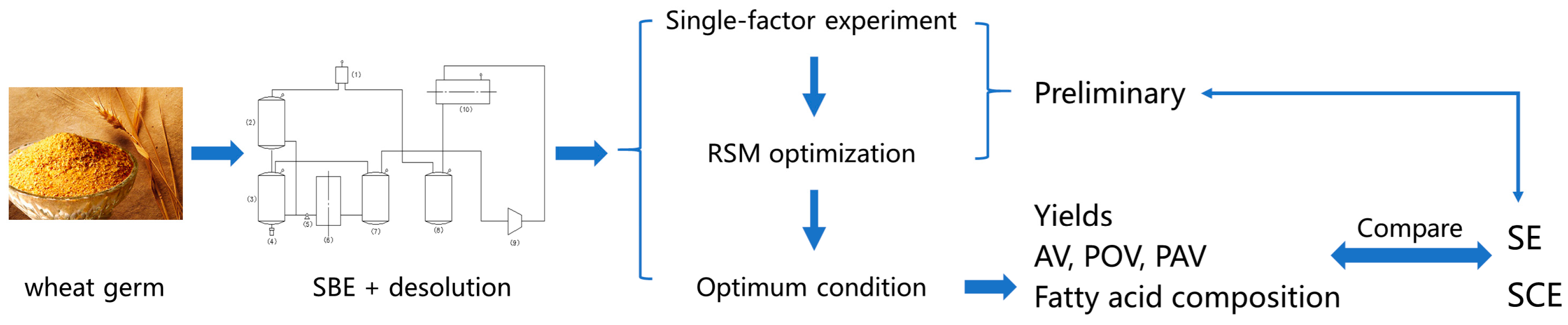 SBE was performed using the apparatus (CBE-5L, Henan Yalinjie Biological Technology Co., Ltd., Anyang, China).The wheat germ (400 g) was loaded into the extractor, and the butane was compressed through a syringe-type pump, transferred to the extractor. The SBE was carried out at the pressure of 0.35 MPa and temperature of 35 °C for 1 h on the basis of the preliminary experiments. Butane was then exhausted at a temperature of 50 °C and the pressure of 0.1 MPa for 45 min. The obtained oil in the separators was collected, weighed and stored in sealed containers at 4 °C for further analysis. The flow diagram was shown in Figure 2.