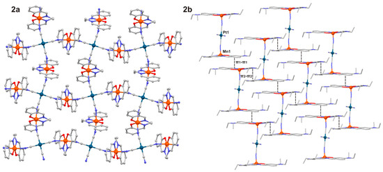 Crystal structure of 2a is isostructural to the previously reported compound [Mn(L4A)}{µ4-Ni(CN)4}]n [15]. The Nim and O donor atoms form the equatorial plane of the coordination polyhedron of the MnIII center, while the axial coordination sites are occupied by two symmetrically equivalent nitrogen atoms (NCN) from bridging [Pt(CN)4]2− anions. Thus, the MnIII atom is hexacoordinate with the {MnN2N’2O2} chromophore. The Mn–NCN bond lengths are significantly longer than the Mn–Nim bonds due to a Jahn-Teller distortion: Mn–NCN = 2.279(8) Å. Each [Pt(CN)4]2− bridging anion bonds to four [Mn(L4A)]+ moieties forming thus a square grid architecture and therefore, the overall crystal structure of 2a can be classified as a two-dimensional polymer (Figure 2). The neighboring [Mn(L4A){µ4-Pt(CN)4}]n layers are weakly interconnected by the offset π−π stacking [16,17,18] of aromatic rings (the shortest C···C distance is 3.319(7) Å).
