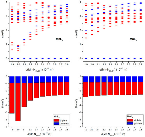 In order to improve our understanding of magnetic anisotropy in these complexes, we performed magneto-structural correlations for pentacoordinate [Mn(L4A)(MeCN)]+ (MnL5) and hexacoordinate [Mn(L4A)(MeCN)2]+ (MnL6) model compounds, where we studied the impact of axial ligand(s) field strength on ZFS parameters by varying Mn−NMeCN distance(s) from 1.9 to 2.8 Å (MeCN = acetonitrile). The geometries of the complexes were optimized with the PBE functional also incorporating the COSMO model (COSMO = COnductor-like Screening MOdel). The only geometrical constrain applied was Mn–NMeCN distance and in case of hexacoordinate MnL6 model compound, the Mn–NMeCN distances were both equal. Subsequently, the single-point energy calculations were done for each optimized geometry using B3LYP/ZORA/def2-TZVP(-f) followed by extracting the information about the splitting of d-orbitals, which is visualized in Figure 4 (top). This figure resembles the well-known crystal-field theory schemes outlined also in Figure 4 (bottom). In the case of hexacoordinate MnL6 model compound with d(Mn–NMeCN) = 1.9 Å, the d-orbitals are evidently split according to scheme outlined for a compressed square-bipyramidal coordination geometry, whereas for increasing Mn–NMeCN distance, the pattern for elongated square-bipyramidal arrangement is observed. Upon further increase in the Mn–NMeCN distance, the d-orbitals are split similarly to square-planar geometry. An analogous situation can be found for the pentacoordinate MnL5 model compound, where an increase in the Mn–NMeCN distance follows d-orbitals splitting from square-pyramidal to square-planar geometry. Of course, DFT-calculated (DFT = Density Functional Theory) energies of d-orbitals are not exactly following simplified schemes derived from the crystal-field theory due to non-equivalent ligand field strengths of Schiff base nitrogen and oxygen donor atoms. Then, ZFS parameters for each geometry were calculated by the same procedure with the CASSCF/NEVPT2 method. The results are depicted in Figure 5.