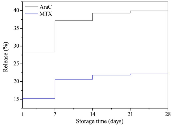 In vitro cytarabine (AraC) and methotrexate (MTX) release from the LDPPC/AraC/MTX liposomes stored at +4 °C for a period of four weeks.