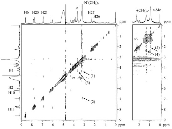 With reference to our previous research on the positioning of cytarabine in the liposome membrane [7,8], it may be concluded that the sugar residue of cytarabine, which contains hydroxyl groups, orients itself towards the lipid–water interface, and the pyrimidine ring penetrates into the glycerol backbone area. Raising the analytical temperature to 47 °C (Figure 6, right panel) confirmed the location of methotrexate in the hydrophobic area of the membrane. In the 2D NOESY spectrum at 47 °C, NOEs are seen between the H26 and H27 protons of methotrexate (Figure 1) and the (CH2)n protons of the alkyl chain of the lipid bilayer (4) and the terminal methylene group (5). Given the results obtained by FT-IR, it can be concluded that the methotrexate molecules are located perpendicularly to the surface of the membrane, passing through the hydrophilic area up to the hydrophobic portion of the membrane.
