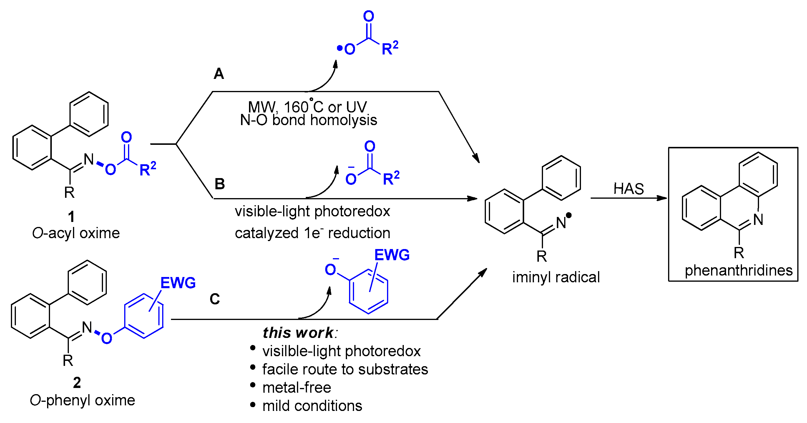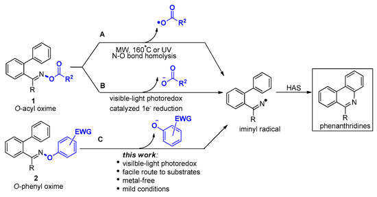 - Jiang, H.; An, X.; Tong, K.; Zheng, T.; Zhang, Y.; Yu, S. Visible-light-promoted iminyl-radical formation from acyl oximes: A unified approach to pyridines, quinolines, and phenanthridines. Angew. Chem. Int. Ed. 2015, 54, 4055–4059. [Google Scholar] [CrossRef] [PubMed]