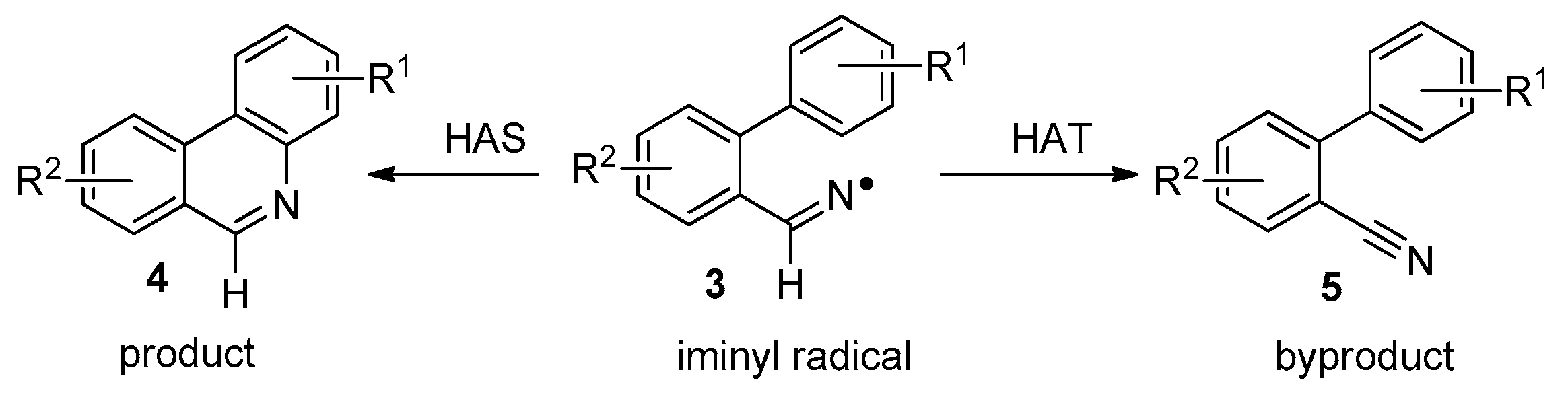 - Zhang, B.; Studer, A. Recent advances in the synthesis of nitrogen heterocycles via radical cascade reactions using isonitriles as radical acceptors. Chem. Soc. Rev. 2015, 44, 3505–3521. [Google Scholar] [CrossRef] [PubMed]