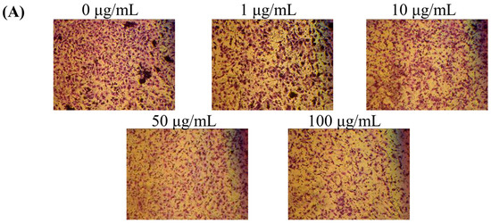 Because MFB inhibited cell proliferation, the number of cells had to be adjusted to an equal number (5 × 105 cells/mL) before the determination of cell migration and cell invasion to avoid interference by cell numbers. Under this condition, we found that MFB (10–100 µg/mL) significantly inhibited the cell invasion of SK-Hep-1 cells in a concentration-dependent manner at 24 h of incubation, with 68% (p < 0.001) inhibition of cell invasion at a concentration of 100 µg/mL MFB (Figure 3). The effects of MFB on cell migration were similar to those on cell invasion—i.e., MFB significantly inhibited cell migration—and the effects were concentration-dependent, with 46% (p < 0.001) inhibition of cell migration at a concentration of 100 µg/mL MFB (Figure 4). The Monascus metabolites have been shown to inhibit metastasis in cancer cells, such as monacolin K [12] and dimerumic acid [13]. For instance, monacolin K has been shown to inhibit metastasis in Lewis lung carcinoma-bearing mice.