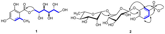 The carbon nuclear magnetic resonance (13C-NMR) spectrum also showed six carbon signals at δc 67.7 (C-1′), 68.1 (C-2′), 69.7 (C-3′), 69.3 (C-4′), 71.2 (C-5′), and 63.8 (C-6′), suggesting the presence of a d-mannitol moiety [17]. The hetero-nuclear single quantum coherence (HSQC) spectroscopy identified one carbonyl (δc 170.2), one phenyl (δc 162.1, 161.5, 141.9, 110.6, 106.5, and 100.5), two oxygenated methylenes (δc 67.7, 63.8), and four oxygenated methines (δc 71.2, 69.7, 69.3, and 68.1). These data suggested that 1 was an orsellinic acid analog. The hetero-nuclear multiple bond correlation (HMBC) confirmed the presence of an orsellinic acid scaffold: H-3/C-1 (δc 106.5), C-2 (δc 162.1), C-5 (δc 110.6), H-5/C-4 (δc 161.5), C-1 (δc 106.5), C-3 (δc 100.5), CH3-6/C-6 (δc 141.9), C-5 (δc 110.6), C-1 (δc 106.5), and C-3 (δc 100.5) (Figure 2). The nuclear Overhauser effect spectroscopy (NOESY) correlation between CH3-6/H-5 and the 1H-NMR [δH 6.18 (1H, br s) and 6.15 (1H, br s)] results were in agreement with the substitution patterns of orsellinic acid. The location of the mannitol moiety at C-7 was deduced from the H-1′/C-7 HMBC correlation. Accordingly, the structure of 1 was determined as d-mannitol orsellinate, trivially named xspolyphenol A.