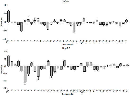 Compounds 1–37 were evaluated for their anti-tumor activity against three human cancer cell lines, the lung adenocarcinoma (A549), liver cancer (HepG2), and gastric carcinoma (MGC-803) cell lines, and one murine foregastric carcinoma (MFC) cell line, which were obtained from Shanghai Cell Bank of Chinese Academy of Sciences (Shanghai, China). Cells were cultured in Dulbecco’s modified eagle medium supplemented with 10% fetal bovine serum (both from Hyclone, South Logan, UT, USA), in 5% CO2 at 37 °C. The anti-tumor assay was performed according to the MTT method [58], with some modifications. In brief, A549, HepG2, MGC-803, and MFC cells were seeded into 96-well plates (5 × 103 cells/well) for 20–24 h under the above conditions, treated with 50 µg/mL of each tested compound, and further incubated for 24 h under the same conditions. After this period, 20 µL of MTT stock solution (5 mg/mL in PBS) were added to each well and samples were incubated for another 4 h, under the same conditions. Supernatants were then removed, and 150 µL of dimethyl sulfoxide were added to each well. After 10 min, absorbance was determined on a Multiskan MK 3 Automated Microplate Reader (Thermo Fisher Scientific, Waltham, MA, USA) at 490 nm, using paclitaxel as the positive control. The percentage inhibition was calculated according to: