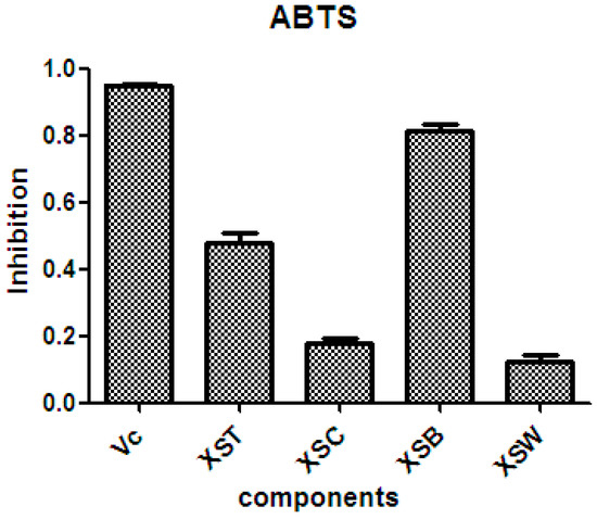 The radical-scavenging activity of the crude samples from X. sorbifolia husks. ABTS was prepared daily and diluted to an absorbance of 0.70 ± 0.02 at 734 nm. After the crude samples (50 µg/mL) reacted with the ABTS radical solution for 10 min, the absorbance values (Ai) at 734 nm were measured, and the percentage inhibitions were calculated. Vc, ascorbic acid; XST, 70% aqueous ethanol extract; XSC, chloroform soluble fraction; XSB, n-butanol soluble fraction; XSW, water soluble fraction. PTX, Paclitaxel.