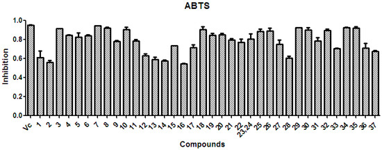 The radical-scavenging activity of the polyphenols (1–37) isolated from X. sorbifolia husks. ABTS was prepared daily and diluted to an absorbance of 0.70 ± 0.02 at 734 nm. After the crude samples (50 µg/mL) reacted with the ABTS radical solution for 10 min, the absorbance values (Ai) at 734 nm were measured, and the percentage inhibitions were calculated. Vc, ascorbic acid.