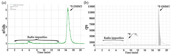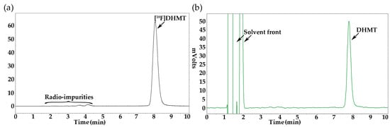 Analytical HPLC chromatograms for [18F]DHMT: (a) radioactivity detection; (b) UV, with co-injection of [19F]DHMT.