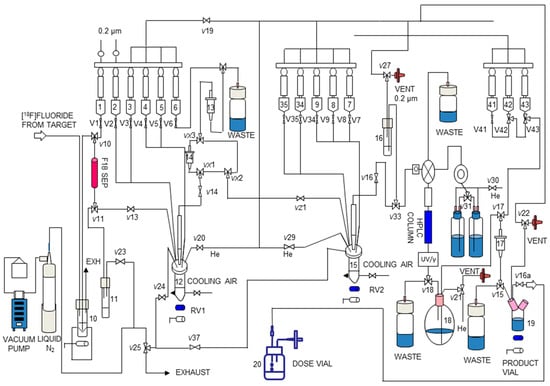 Schematic of the TRACERLab® FXN Pro automated module for radiosynthesis of [18F]DHMT.