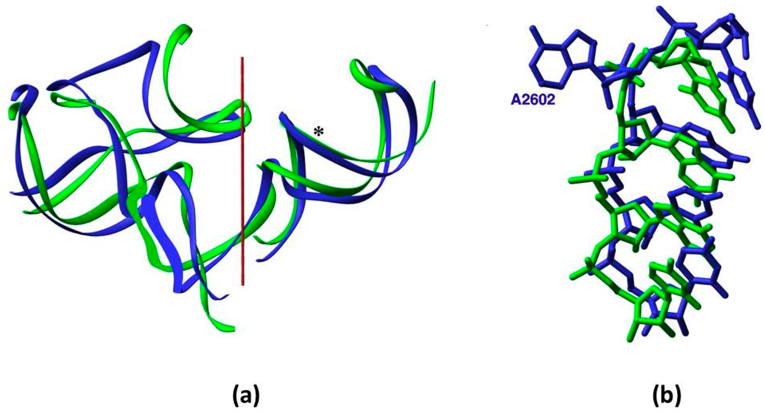 Symmetry: (a) Overlap of the backbone fold of the A- and the P-sub-regions, obtained by rotating the A-sub-region by 179.6° around the symmetry axis (in red); (b) The compatibility between the nucleotide conformation in the overlapped segments of the symmetry-related H89 and H93, whose backbone is marked by an asterisk in (a). Nucleotide A2602, which was suggested to be actively involved in translocation, diverges from the symmetry and bulges into the essentially symmetric PTC [7,8].