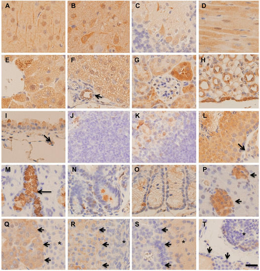 Immunohistochemistry for MST in various tissues of mice. (A) Cerebral cortex; (B) Thalamus; (C) Cerebellar cortex; (D) Heart muscle; (E) Central region of the liver; (F) Peri-portal liver tissue. Bile ductule (arrow); (G) Renal cortex; (H) Renal medulla and pelvic epithelium; (I) Bronchiole and alveolus. Type 2 alveolar cell (arrow); (J) Spleen; (K) Thymus; (L) Testis. Leydic cell (arrow); (M) Submandibular gland. Granular convoluted tubule (arrow); (N) Small intestines; (O) Colon; (P) Pancreas. Islet (arrows); (Q) Adrenal medulla (arrows). Reticular zone (asterisk); (R) Adrenal cortex. Fasciculata zone (arrows) and glomerular zone (asterisk); (S) Pituitary gland. Anterior lobe (arrows) and intermediate zone (asterisk); (T) Thyroid (arrows) and parathyroid (asterisk). Bar = 20 μm.