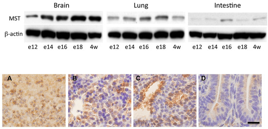 Expression of MST in fetal developing mice. (Upper panel) Western blotting analysis for MST in the developing fetal brain, lungs, intestines: e12 (fetal day 12), e14 (fetal day 14), e16 (fetal day 16), e18 (fetal day18), and 4w (4 week old); (Lower panel) Immunohistochemistry for MST in fetal day 16 mouse tissues; (A) Cerebral cortex; (B) Liver; (C) Lung; (D) Intestines. Bar = 20 μm.