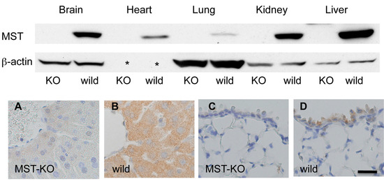 Expression of MST in MST gene–deficient mice. (Upper panel) No expression of MST in the brain, heart, lungs, kidneys, and liver of MST gene–deficient mouse (KO). β-actin is not detected in the heart (asterisk); (Lower panel) Immunohistochemistry for MST in an MST gene–deficient mouse (MST-KO) and a control mouse (wild); (A,B) Liver; (C,D) Lung. Bar = 20 μm.