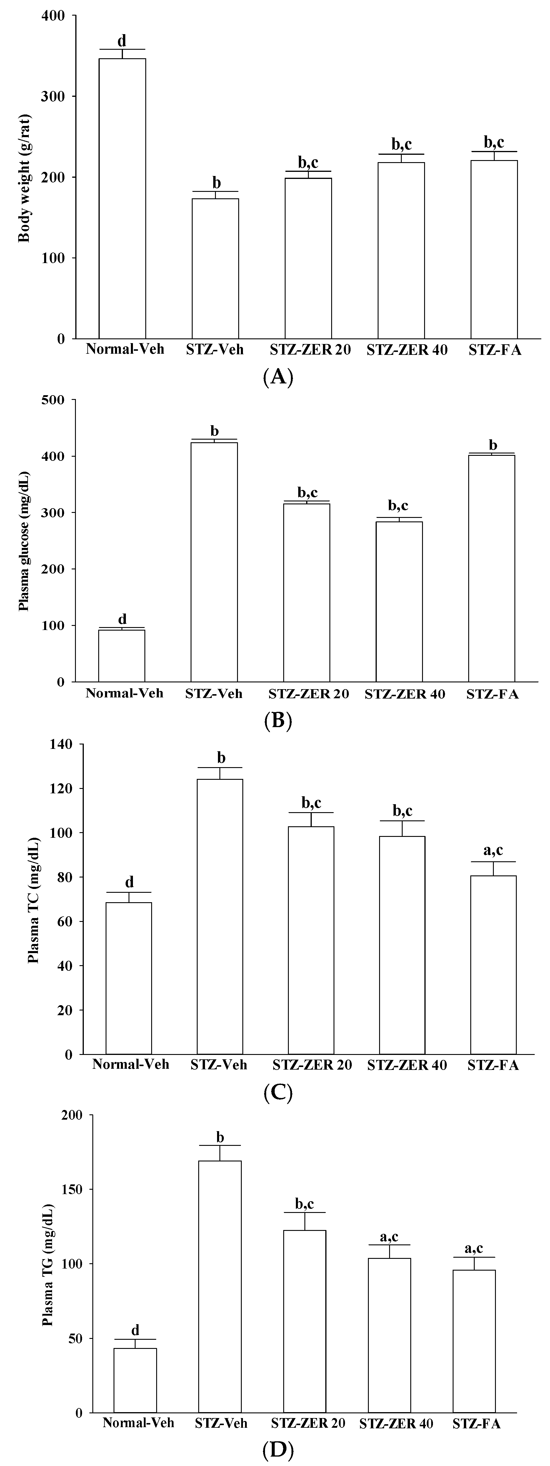 Changes in body weight (A) and plasma glucose (B), TC (C) and TG (D) in normal or STZ-diabetic rats receiving three months of treatment. STZ-diabetic rats were administered 20 mg/kg/day zerumbone (STZ-ZER 20), 40 mg/kg/day zerumbone (STZ-ZER 40) or 100 mg/kg fenofibric acid (STZ-FA) by oral gavage once daily for three months. Another group of STZ-diabetic rats (STZ-Veh) and normal rats (Normal-Veh) were administered the same volume of vehicle used to prepare the test medication solutions. Data are mean ± SD from eight rats per group. a p < 0.05 and b p < 0.01 compared to vehicle-treated normal rats, respectively; c p < 0.05 and d p < 0.01 compared to the values of vehicle-treated STZ-diabetic rats, respectively.
