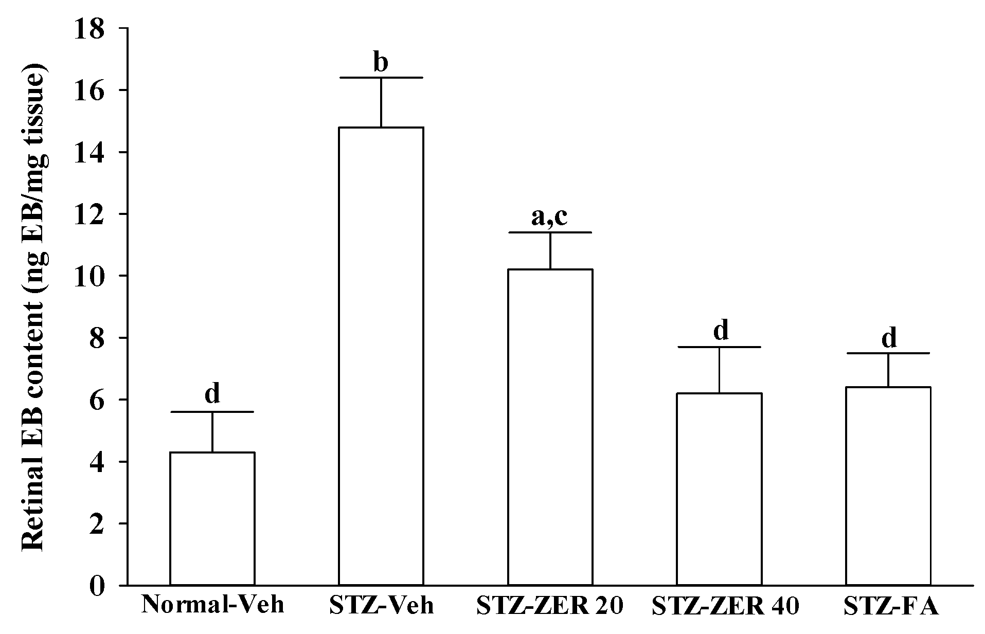 Increased leakage was observed in the retinas of STZ-diabetic rats (Figure 3). Treatment of STZ-diabetic rats with 20 or 40 mg/kg/day zerumbone for three months decreased retinal EB dye accumulation by 31.8% and 58.1%, respectively, when compared with the levels observed in the vehicle-treated counterparts (Figure 3). Diabetes-induced retinal vessel leakage was decreased by 56.7% in STZ-diabetic rats treated with fenofibric acid when compared with their vehicle-paired counterparts (Figure 3).