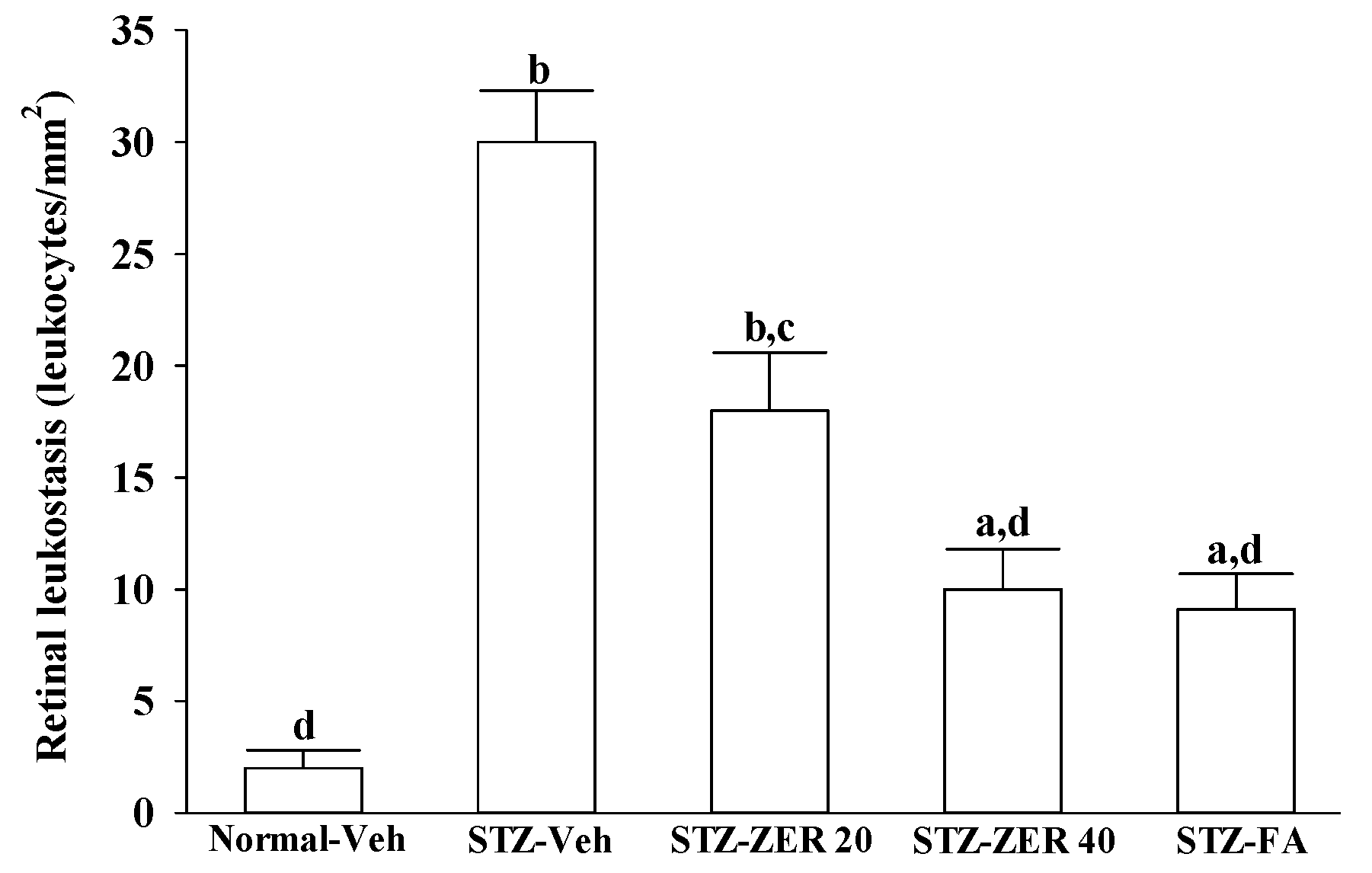 Effects on retinal leukostasis. STZ-diabetic rats were administered 20 mg/kg/day zerumbone (STZ-ZER 20), 40 mg/kg/day zerumbone (STZ-ZER 40) or 100 mg/kg fenofibric acid (STZ-FA) by oral gavage once daily for three months. Another group of STZ-diabetic rats (STZ-Veh) and normal rats (Normal-Veh) were administered the same volume of vehicle used to prepare the test medication solutions. The total number of adherent leukocytes per retina was counted. Data are mean ± SD from eight rats per group, and the experiments were repeated independently at least three times with similar results. a p < 0.05 and b p < 0.01 compared to vehicle-treated normal rats, respectively; c p < 0.05 and d p < 0.01 compared to the values of vehicle-treated STZ-diabetic rats, respectively.