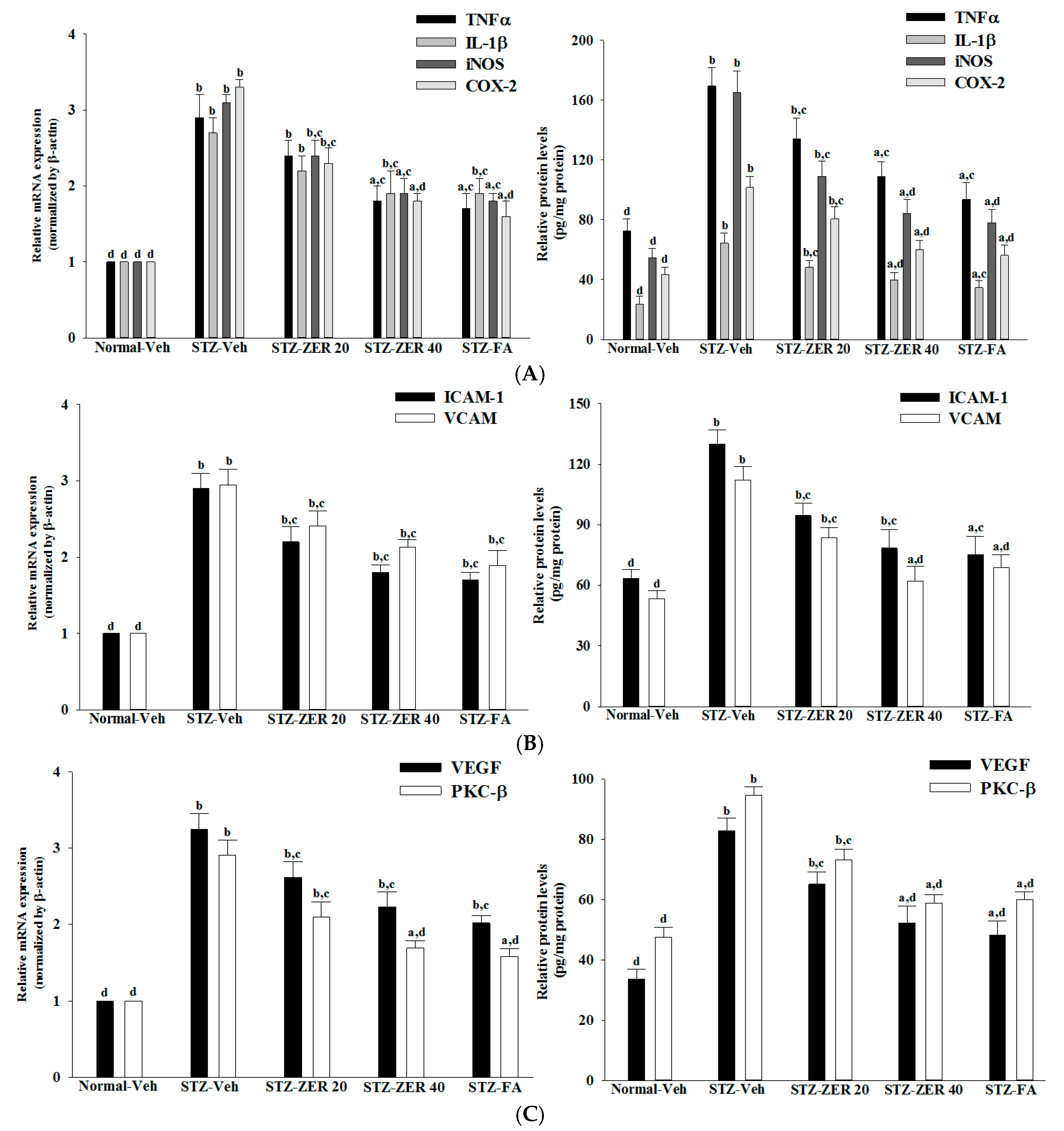 Effects on mRNA (left pannels) and protein expression (right pannels) of inflammatory cytokines (A), chemokines (B) and angiogenic parameters (C). STZ-diabetic rats were administered 20 mg/kg/day zerumbone (STZ-ZER 20), 40 mg/kg/day zerumbone (STZ-ZER 40) or 100 mg/kg fenofibric acid (STZ-FA) by oral gavage once daily for three months. Another group of STZ-diabetic rats (STZ-Veh) and normal rats (Normal-Veh) were administered the same volume. Data are mean ± SD from eight rats per group, and the experiments were repeated independently at least three times with similar results. a p < 0.05 and b p < 0.01 compared to vehicle-treated normal rats, respectively; c p < 0.05 and d p < 0.01 compared to the values of vehicle-treated STZ-diabetic rats, respectively.
