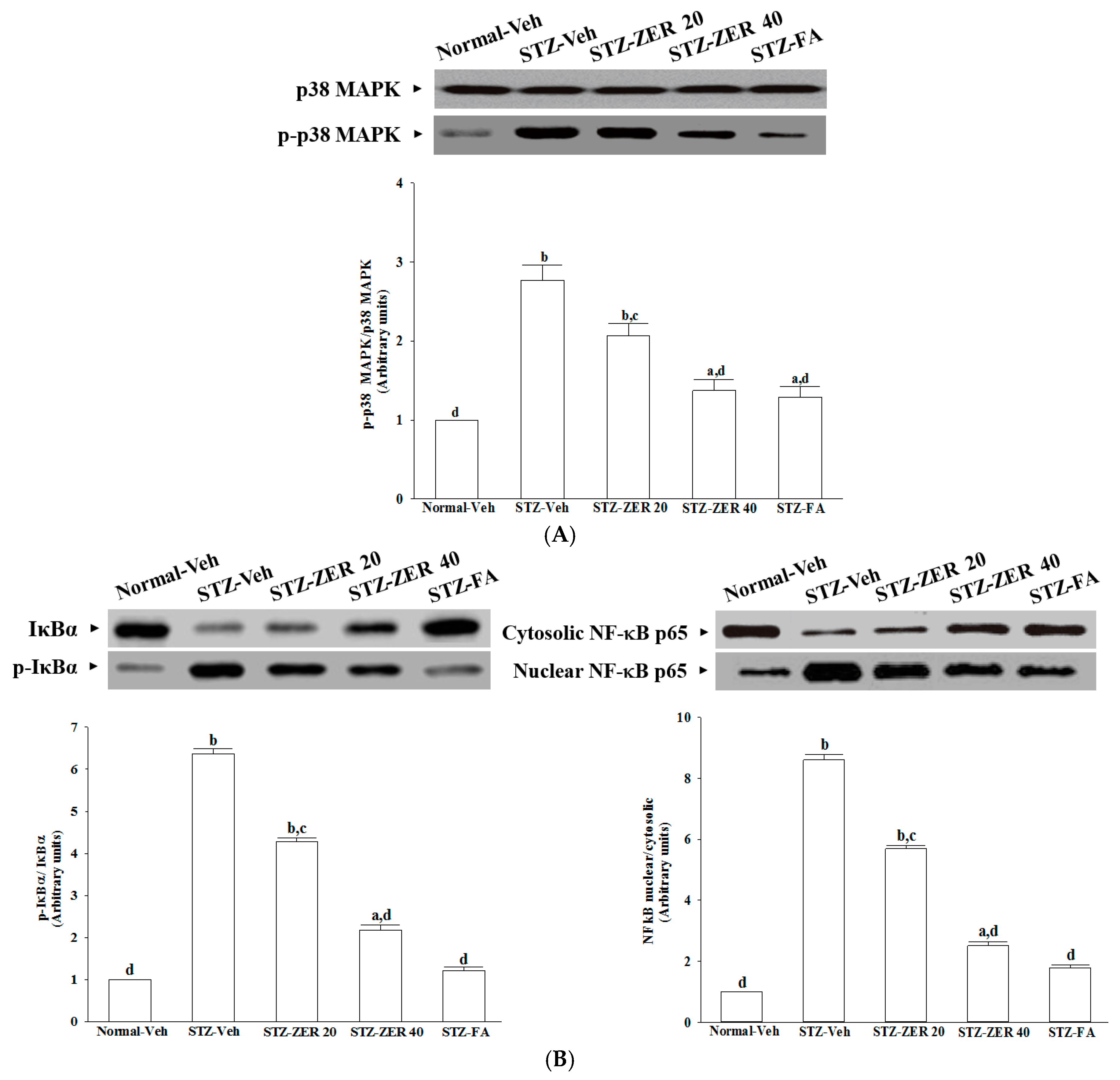 Effects on retinal p38 MAPK (A) and NF-κB (B) activation. STZ-diabetic rats were administered 20 mg/kg/day zerumbone (STZ-ZER 20), 40 mg/kg/day zerumbone (STZ-ZER 40) or 100 mg/kg fenofibric acid (STZ-FA) by oral gavage once daily for three months. Another group of STZ-diabetic rats (STZ-Veh) and normal rats (Normal-Veh) were administered the same volume. The expression and phosporylation of retinal IkB protein have been indicated in left pannel on Figure 6B. NF-κB p65 expression in nuclear and cytosolic fractions of retinas from rats has been shown in right pannel on Figure 6B. Data are mean ± SD from eight rats per group, and the experiments were repeated independently at least three times with similar results. a p < 0.05 and b p < 0.01 compared to vehicle-treated normal rats, respectively; c p < 0.05 and d p < 0.01 compared to the values of vehicle-treated STZ-diabetic rats, respectively.
