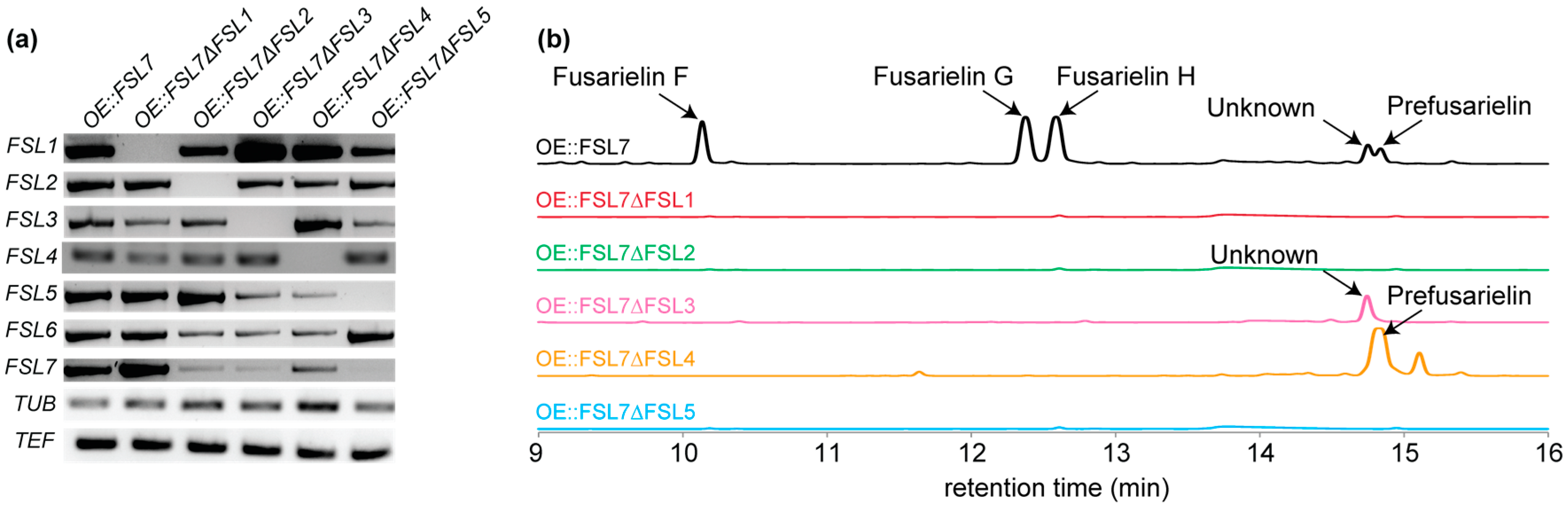 Transcription and metabolite analyses of OE::FSL7 and OE::FSL7ΔFSL1-5. (a) Reverse transcription polymerase chain reaction (RT-PCR) of FSL1-7, the translation elongation factor 1α (TEF) and β-tubulin (TUB) were included as controls; (b) Partial HPLC-UV chromatograms measured at 249 nm.