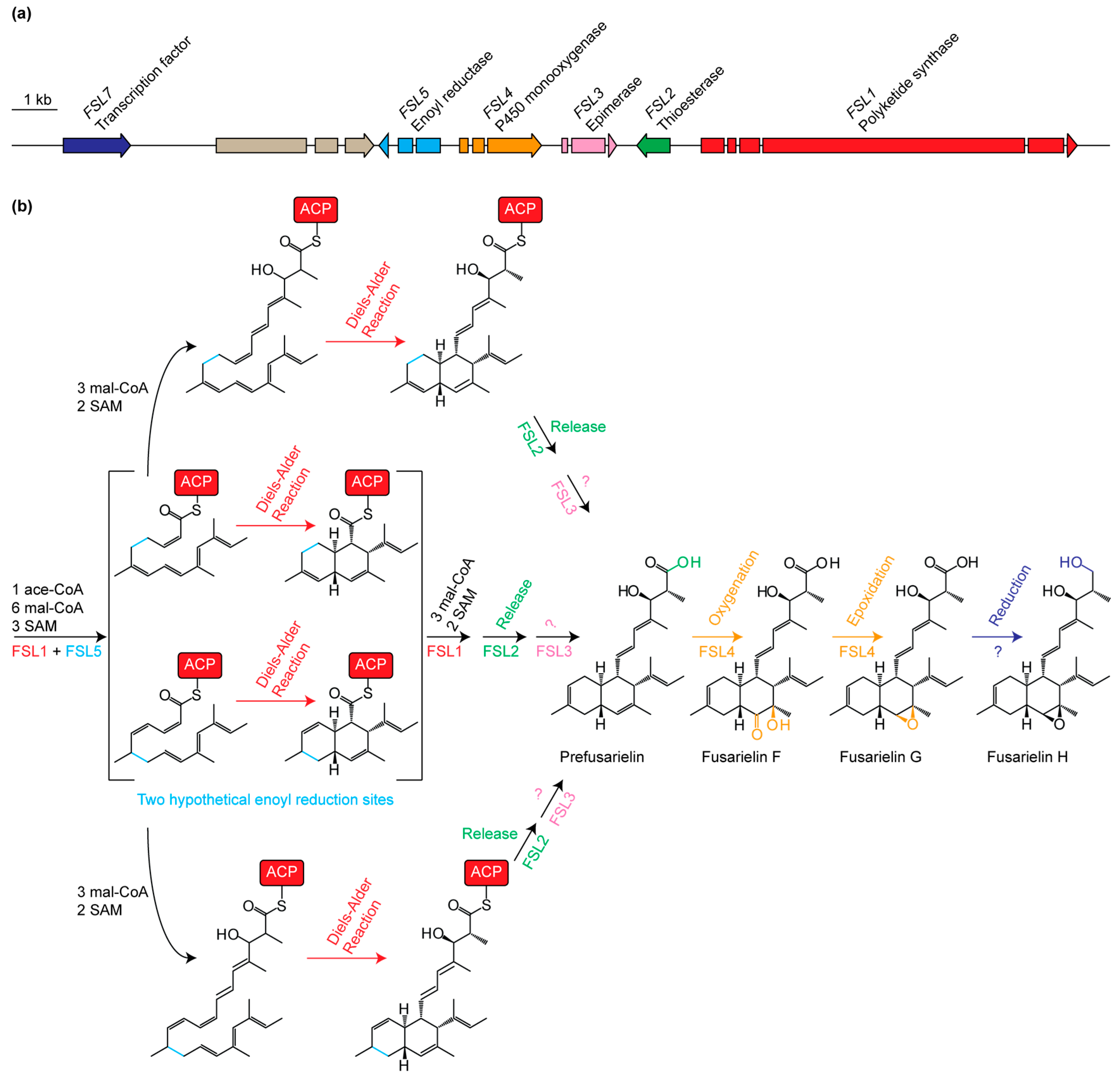 (a) Overview of the gene cluster with the six genes involved in fusarielin biosynthesis; (b) Possible pathways for fusarielin biosynthesis in Fusarium graminearum, which uses one acetyl-CoA (ace-CoA), nine malonyl-CoA (mal-CoA), and five S-Adenosylmethionine (SAM) subunits. The Diels-Alder reaction can occur at the heptaketide stage or when chain elongation has completed. The growing polyketide chain is attached to the acyl carrier protein (ACP) domain of FSL1. Two possible enoyl reduction sites are highlighted.