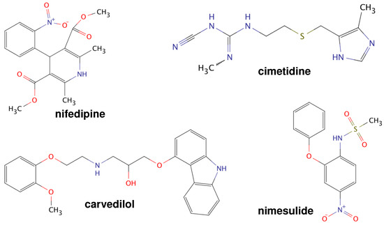 Chemical structures of carvedilol (CAR), cimetidine (CIM), nifedipine (NIF) and nimesulide (NIM).