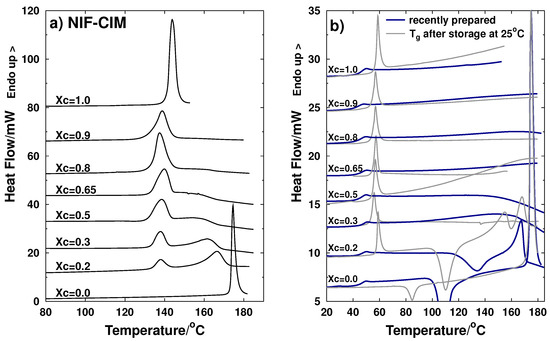 Thermograms of the NIF-CIM binary system obtained by Differential Scanning Calorimetry (DSC). The mole fractions are expressed in terms of cimetidine () (a) crystalline samples (b) amorphous samples: plots with blue thick lines correspond to the measurement of the glass transition temperature performed immediately after the quenching of the molten sample. Thin gray lines correspond to the measurements performed after 133 days of storage at 25 C. (except for samples and that correspond to 80 days and 40 days of storage, respectively). Heating rate was 10 C/min in all cases.