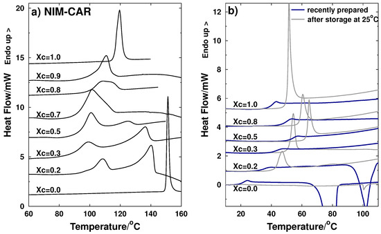 Figure 3b shows thermograms of amorphous samples obtained by melt-quenching. For the recently prepared samples, it can be observed that NIM shows a crystallization peak at 78 C, consistent with the value reported previously by Pajula et al. of 79 C [29]. Nimesulide is unstable in an amorphous state, and it can be observed that stabilization of the amorphous state can be achieved by adding carvedilol, since, for compositions from to , only a glass transition process is observed and no crystallization process is present. Together with the thermograms for the samples measured immediately after preparation, Figure 3b also shows the thermograms of stored samples (85 days of storage at 25 C). As it was observed for the NIM-CIM system, the thermograms of the stored NIM-CAR samples also present a clear overshoot at the glass transition due to the structural relaxation of the material. Once again, the glass transition temperatures are in all cases higher by almost 10 C in the stored samples compared to the values measured right after the quenching.
