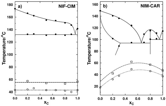 From the transition temperatures observed in the thermograms shown in Figure 3a, a phase diagram for NIM-CAR was constructed in which the glass transition temperatures for the recently prepared amorphous samples and those measured after a storage period of 85 days are also included. It can be observed that, in this binary system, the glass transition temperatures are higher for the mixtures than for the pure components, and, for all stored samples, an increment of was observed of about 11 C.