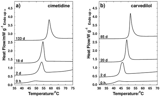 Measurements of after a certain storage time were performed to study behavior of glass transition and relaxation processes for samples stored at 25 C. Results are shown in Figure 5 for pure cimetidine and carvedilol (nimesulide and nifedipine samples presented crystallization and therefore are not included in this analysis) and Figure 6 for the binary mixtures NIF-CIM and NIM-CAR of composition .