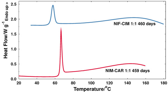 The stability of two unstable active ingredients in amorphous state (NIM and NIF) was markedly increased to almost two years by formulating them as co-amorphous binary systems. As evidence of the long-term stability of the new co-amorphous formulations presented in this work, Figure 8 shows thermograms of binary systems that have remained stable in the amorphous state for a period longer than fifteen months (samples are still stable and still being monitored).