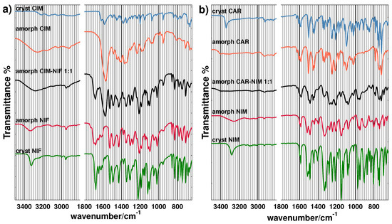 Fourier transform infrared (FTIR) spectra for crystalline and amorphous samples of pure active ingredients and amorphous 1:1 mixture for the systems (a) cimetidine–nifedipine and (b) carvedilol–nimesulide.