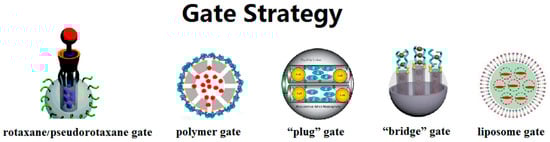 The gate strategy, which controls the flow of drug molecules, is the major highlight of MSN-based DDSs. The switch gates can exist in many forms: rotaxane/pseudorotaxane gates, polymer gates, “plug” gates, “bridge” gates, liposome gates, etc. (Figure 2). The switch function of rotaxane/pseudorotaxane type gates relies on the conformation change of these supramolecular assemblies. Non-covalent, intermolecular interactions such as electrostatic interaction, hydrophobic force and C–H···π interactions contribute to build the assemblies []. When the system is exposed to external stimuli, the original intermolecular forces are interrupted, resulting in conformational changes of the rotaxane/pseudorotaxane. On the orifice of MSNs, this changing conformation can change the blocking effect toward the internal drug molecules. Our research group has developed several such gates on MSNs. In 2014, we developed pseudo[1]rotaxane supramolecular nanovalves []. Anchoring a β-cyclodextrin derivative, mono-2-O-{1-(1H-benzoimidazol-2-yl-methyl)-1H-[1,2,3]triazole-4-ylmethyl}-β-cyclodextrin (BZI-βCD) onto the outside surface of MSNs through covalent bonds, the cavities of BZI-βCD were connected with the mesopores of MSNs. Under neutral conditions, the benzimidazole part would embed into the cavities of BZI-βCD driven by hydrophobic forces. When placed in an acidic solution, the protonated benzimidazole part detached from the cavity of BZI-βCD due to the decreased affinity constant. Therefore, the acid stimulus removes the blocking benzimidazole part and releases the p-coumaric acid molecules inside through the cavities of BZI-βCD. In our recent research, we installed another pseudo[2]rotaxane supramolecular nanovalve []. The release behavior was also triggered by a pH-caused conformation change: we realized switch binding between the novel macrocyclic molecule-carboxylic water-soluble pillar[5]arene (WP5) and the stalk molecule 1,6-(1-pyridiniumbromidehexyl)-hexanediamine (APy-HDA) with two different sites. In vitro experiment results show that DDSs with this gate have ablation ability towards MCF7 cells.