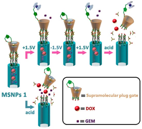 Schematic diagram of a macrocyclic molecule derivative plug gate. DOX, doxorubicin; GEM, gemcitabine. Reprinted with permission from []. Copyright 2015 American Chemical Society.