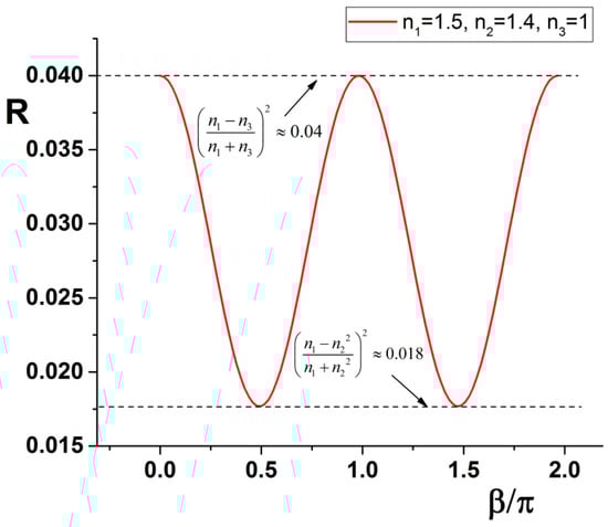 The reflectance R is plotted following Equation (18) having n1 = 1.5, n2 = 1.4, n3 = 1. The amplitude oscillates between the extremes described in Equation (19).