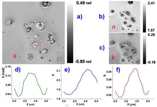 On the left is visible the RBC phase image (a); obtained by KK transformation of the HSCM image of Figure 4, at 700 nm. The image appears completely different from the correspondent reflectance image, while it is very similar to an ordinary phase-contrast optical microscopy images; On the right, the correspondent n and k images at 700 nm (b,c); The value bars, referred to the respective images, also include in the range image parts where the computed values have no sense, like the substrate or RBC boundaries for which the Fresnel expressions are not valid. An example of local values is given for an RBC marked of the left image: a cross-section is shown for the phase θ (d) and the components n and k (e,f) of the computed index of refraction. The values, however, have to be interpreted with the aid of the formalism in the text (e.g., see Equation (12)). The full wavelength dependence of n is accessible as a supplemental AVI file.